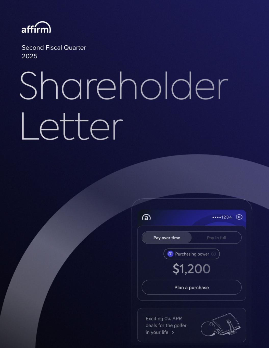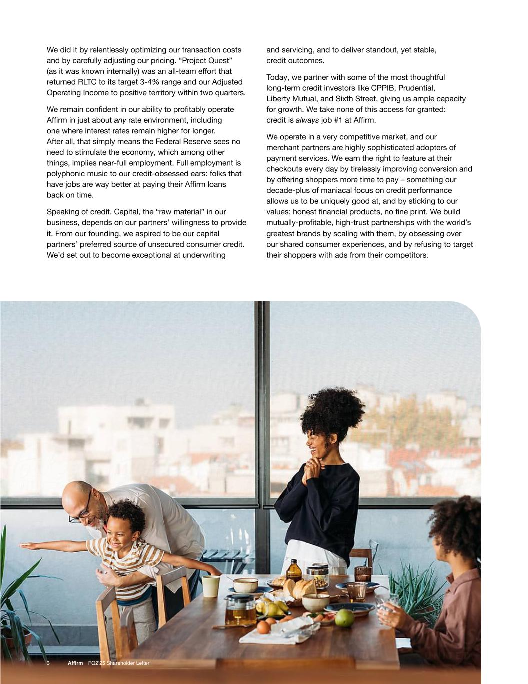 3 Affirm FQ2’25 Shareholder Letter We did it by relentlessly optimizing our transaction costs and by carefully adjusting our pricing. “Project Quest” (as it was known internally) was an all-team effort that returned RLTC to its target 3-4% range and our Adjusted Operating Income to positive territory within two quarters. We remain confident in our ability to profitably operate Affirm in just about any rate environment, including one where interest rates remain higher for longer. After all, that simply means the Federal Reserve sees no need to stimulate the economy, which among other things, implies near-full employment. Full employment is polyphonic music to our credit-obsessed ears: folks that have jobs are way better at paying their Affirm loans back on time. Speaking of credit. Capital, the “raw material” in our business, depends on our partners’ willingness to provide it. From our founding, we aspired to be our capital partners’ preferred source of unsecured consumer credit. We’d set out to become exceptional at underwriting and servicing, and to deliver standout, yet stable, credit outcomes. Today, we partner with some of the most thoughtful long-term credit investors like CPPIB, Prudential, Liberty Mutual, and Sixth Street, giving us ample capacity for growth. We take none of this access for granted: credit is always job #1 at Affirm. We operate in a very competitive market, and our merchant partners are highly sophisticated adopters of payment services. We earn the right to feature at their checkouts every day by tirelessly improving conversion and by offering shoppers more time to pay – something our decade-plus of maniacal focus on credit performance allows us to be uniquely good at, and by sticking to our values: honest financial products, no fine print. We build mutually-profitable, high-trust partnerships with the world’s greatest brands by scaling with them, by obsessing over our shared consumer experiences, and by refusing to target their shoppers with ads from their competitors.