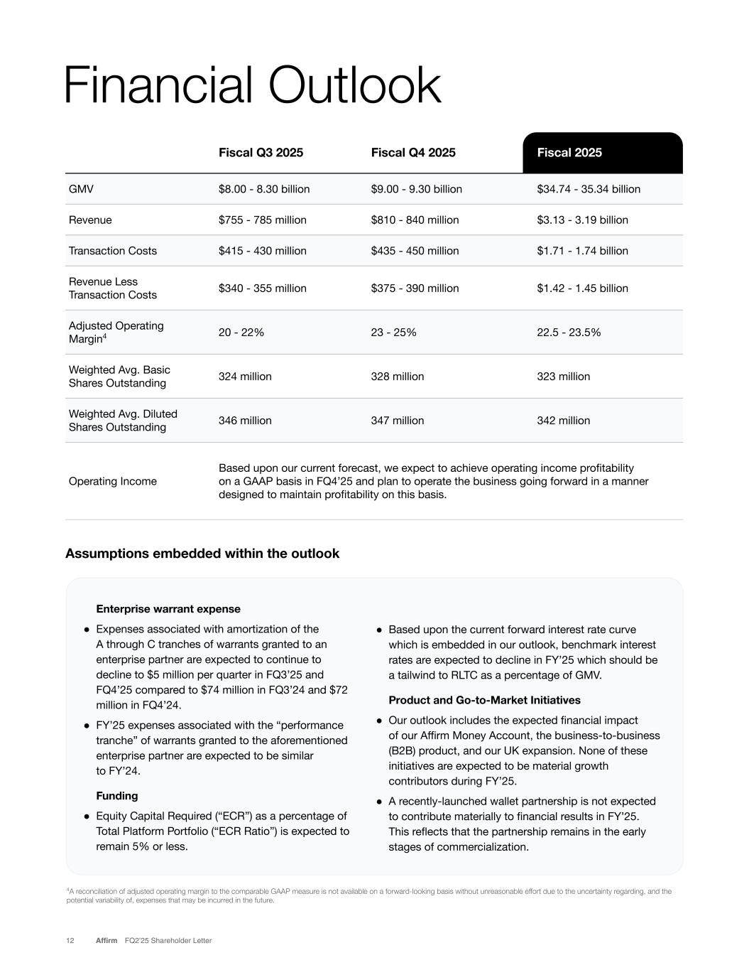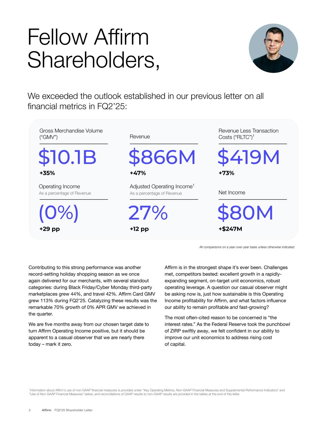 We exceeded the outlook established in our previous letter on all financial metrics in FQ2’25: Fellow Affirm Shareholders, 2 Affirm FQ2’25 Shareholder Letter 1Information about Affirm's use of non-GAAP financial measures is provided under “Key Operating Metrics, Non-GAAP Financial Measures and Supplemental Performance Indicators” and “Use of Non-GAAP Financial Measures” below, and reconciliations of GAAP results to non-GAAP results are provided in the tables at the end of this letter. $419M Revenue Less Transaction Costs (“RLTC”)1 +73% $866M Revenue +47% $10.1B Gross Merchandise Volume (“GMV”) +35% Net Income +$247M 27% Adjusted Operating Income1 As a percentage of Revenue +12 pp (0%) Operating Income As a percentage of Revenue +29 pp $80M Affirm is in the strongest shape it’s ever been. Challenges met, competitors bested: excellent growth in a rapidly- expanding segment, on-target unit economics, robust operating leverage. A question our casual observer might be asking now is, just how sustainable is this Operating Income profitability for Affirm, and what factors influence our ability to remain profitable and fast-growing? The most often-cited reason to be concerned is “the interest rates.” As the Federal Reserve took the punchbowl of ZIRP swiftly away, we felt confident in our ability to improve our unit economics to address rising cost of capital. Contributing to this strong performance was another record-setting holiday shopping season as we once again delivered for our merchants, with several standout categories: during Black Friday/Cyber Monday third-party marketplaces grew 44%, and travel 42%. Affirm Card GMV grew 113% during FQ2’25. Catalyzing these results was the remarkable 70% growth of 0% APR GMV we achieved in the quarter. We are five months away from our chosen target date to turn Affirm Operating Income positive, but it should be apparent to a casual observer that we are nearly there today – mark it zero. All comparisons on a year-over-year basis unless otherwise indicated