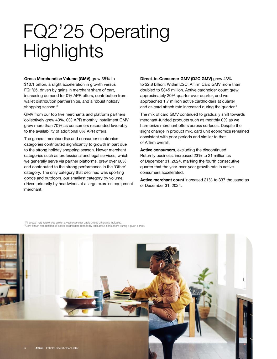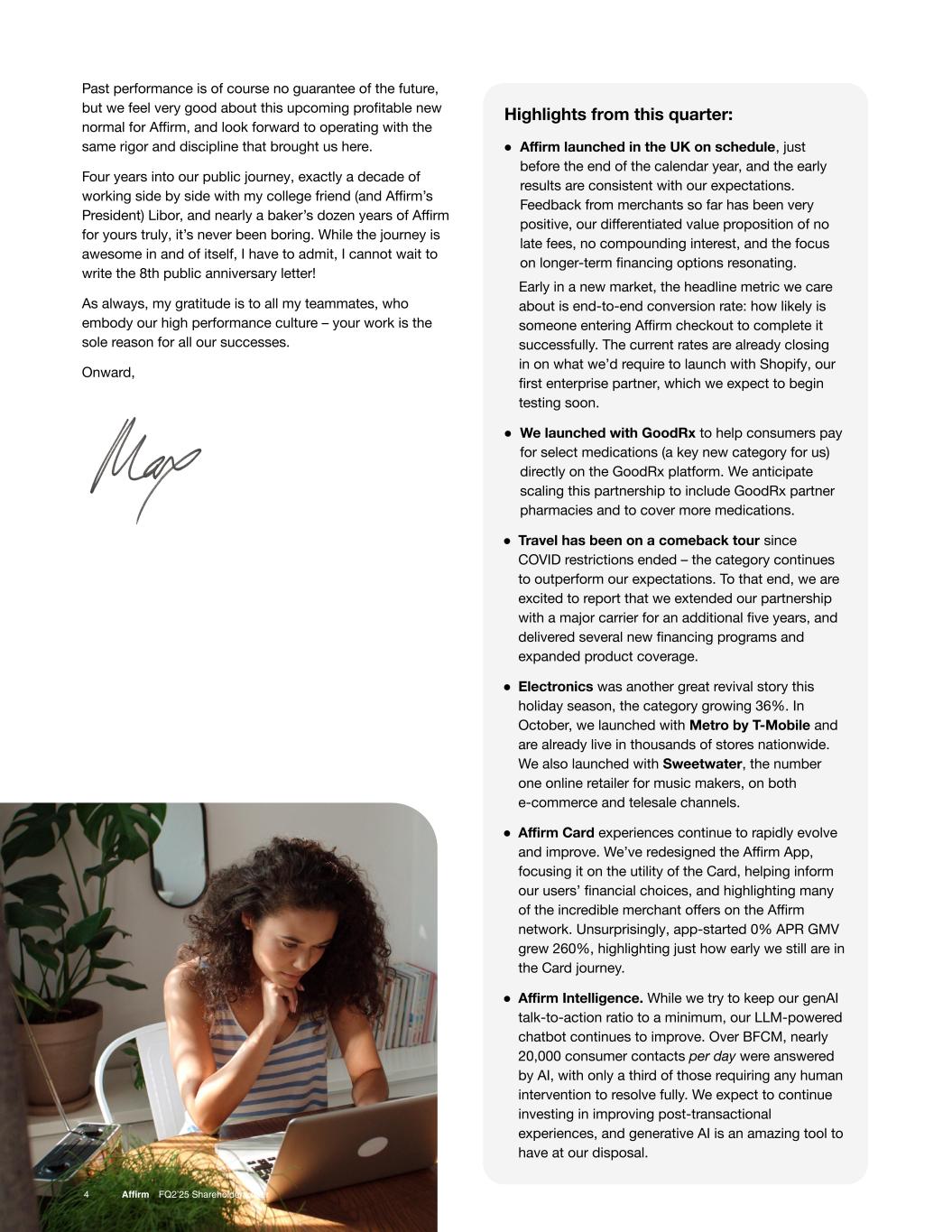 44 Affirm FQ2’25 Shareholder Letter Past performance is of course no guarantee of the future, but we feel very good about this upcoming profitable new normal for Affirm, and look forward to operating with the same rigor and discipline that brought us here. Four years into our public journey, exactly a decade of working side by side with my college friend (and Affirm’s President) Libor, and nearly a baker’s dozen years of Affirm for yours truly, it’s never been boring. While the journey is awesome in and of itself, I have to admit, I cannot wait to write the 8th public anniversary letter! As always, my gratitude is to all my teammates, who embody our high performance culture – your work is the sole reason for all our successes. Onward, Highlights from this quarter: ● Affirm launched in the UK on schedule, just before the end of the calendar year, and the early results are consistent with our expectations. Feedback from merchants so far has been very positive, our differentiated value proposition of no late fees, no compounding interest, and the focus on longer-term financing options resonating. Early in a new market, the headline metric we care about is end-to-end conversion rate: how likely is someone entering Affirm checkout to complete it successfully. The current rates are already closing in on what we’d require to launch with Shopify, our first enterprise partner, which we expect to begin testing soon. ● We launched with GoodRx to help consumers pay for select medications (a key new category for us) directly on the GoodRx platform. We anticipate scaling this partnership to include GoodRx partner pharmacies and to cover more medications. ● Travel has been on a comeback tour since COVID restrictions ended – the category continues to outperform our expectations. To that end, we are excited to report that we extended our partnership with a major carrier for an additional five years, and delivered several new financing programs and expanded product coverage. ● Electronics was another great revival story this holiday season, the category growing 36%. In October, we launched with Metro by T-Mobile and are already live in thousands of stores nationwide. We also launched with Sweetwater, the number one online retailer for music makers, on both e-commerce and telesale channels. ● Affirm Card experiences continue to rapidly evolve and improve. We’ve redesigned the Affirm App, focusing it on the utility of the Card, helping inform our users’ financial choices, and highlighting many of the incredible merchant offers on the Affirm network. Unsurprisingly, app-started 0% APR GMV grew 260%, highlighting just how early we still are in the Card journey. ● Affirm Intelligence. While we try to keep our genAI talk-to-action ratio to a minimum, our LLM-powered chatbot continues to improve. Over BFCM, nearly 20,000 consumer contacts per day were answered by AI, with only a third of those requiring any human intervention to resolve fully. We expect to continue investing in improving post-transactional experiences, and generative AI is an amazing tool to have at our disposal.