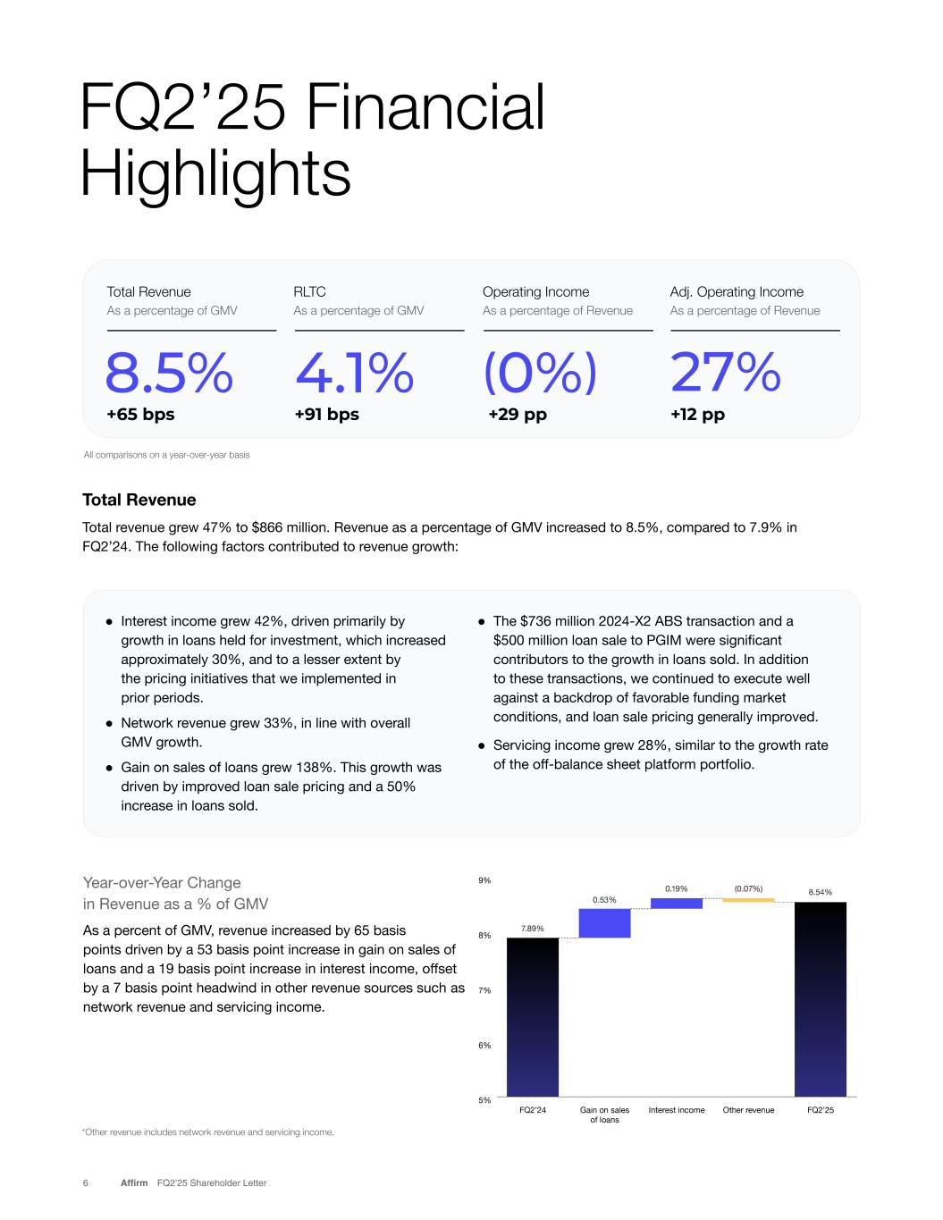 FQ2’25 Financial Highlights Year-over-Year Change in Revenue as a % of GMV As a percent of GMV, revenue increased by 65 basis points driven by a 53 basis point increase in gain on sales of loans and a 19 basis point increase in interest income, offset by a 7 basis point headwind in other revenue sources such as network revenue and servicing income. *Other revenue includes network revenue and servicing income. 6 Affirm FQ2’25 Shareholder Letter Total Revenue Total revenue grew 47% to $866 million. Revenue as a percentage of GMV increased to 8.5%, compared to 7.9% in FQ2’24. The following factors contributed to revenue growth: Total Revenue As a percentage of GMV 8.5% +65 bps RLTC As a percentage of GMV 4.1% +91 bps Operating Income As a percentage of Revenue 0% +29 pp ( ) Adj. Operating Income As a percentage of Revenue 27% +12 pp All comparisons on a year-over-year basis ● Interest income grew 42%, driven primarily by growth in loans held for investment, which increased approximately 30%, and to a lesser extent by the pricing initiatives that we implemented in prior periods. ● Network revenue grew 33%, in line with overall GMV growth. ● Gain on sales of loans grew 138%. This growth was driven by improved loan sale pricing and a 50% increase in loans sold. ● The $736 million 2024-X2 ABS transaction and a $500 million loan sale to PGIM were significant contributors to the growth in loans sold. In addition to these transactions, we continued to execute well against a backdrop of favorable funding market conditions, and loan sale pricing generally improved. ● Servicing income grew 28%, similar to the growth rate of the off-balance sheet platform portfolio.
