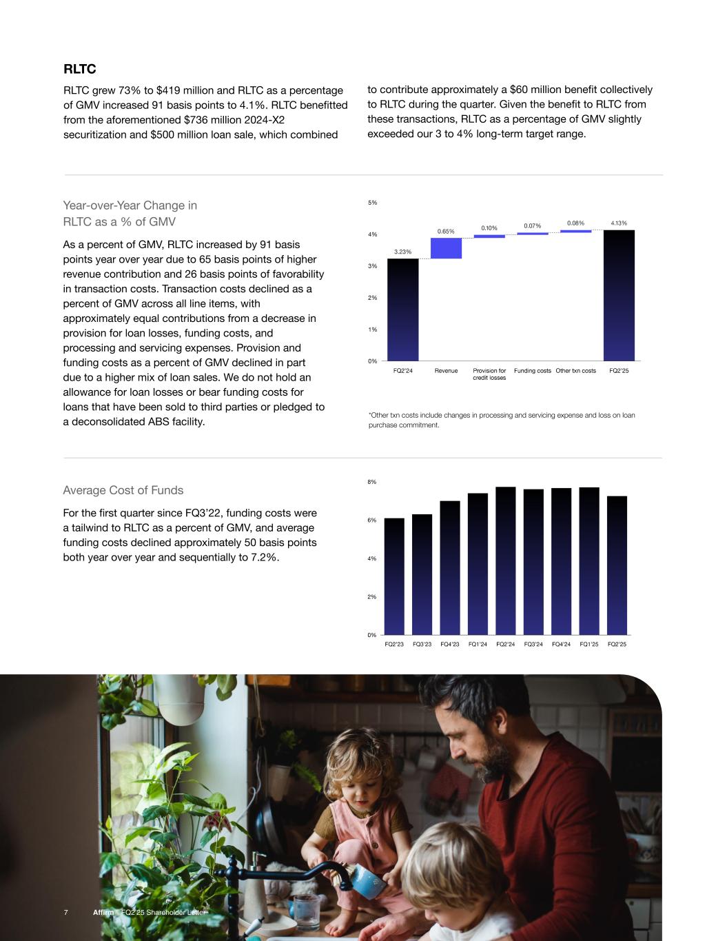 7 Affirm FQ2’25 Shareholder Letter RLTC RLTC grew 73% to $419 million and RLTC as a percentage of GMV increased 91 basis points to 4.1%. RLTC benefitted from the aforementioned $736 million 2024-X2 securitization and $500 million loan sale, which combined Year-over-Year Change in RLTC as a % of GMV As a percent of GMV, RLTC increased by 91 basis points year over year due to 65 basis points of higher revenue contribution and 26 basis points of favorability in transaction costs. Transaction costs declined as a percent of GMV across all line items, with approximately equal contributions from a decrease in provision for loan losses, funding costs, and processing and servicing expenses. Provision and funding costs as a percent of GMV declined in part due to a higher mix of loan sales. We do not hold an allowance for loan losses or bear funding costs for loans that have been sold to third parties or pledged to a deconsolidated ABS facility. Average Cost of Funds For the first quarter since FQ3’22, funding costs were a tailwind to RLTC as a percent of GMV, and average funding costs declined approximately 50 basis points both year over year and sequentially to 7.2%. *Other txn costs include changes in processing and servicing expense and loss on loan purchase commitment. to contribute approximately a $60 million benefit collectively to RLTC during the quarter. Given the benefit to RLTC from these transactions, RLTC as a percentage of GMV slightly exceeded our 3 to 4% long-term target range.