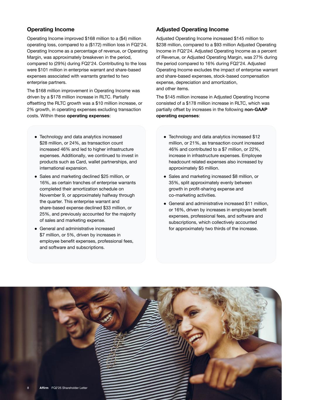 8 Affirm FQ2’25 Shareholder Letter Operating Income Operating Income improved $168 million to a ($4) million operating loss, compared to a ($172) million loss in FQ2’24. Operating Income as a percentage of revenue, or Operating Margin, was approximately breakeven in the period, compared to (29%) during FQ2’24. Contributing to the loss were $101 million in enterprise warrant and share-based expenses associated with warrants granted to two enterprise partners. The $168 million improvement in Operating Income was driven by a $178 million increase in RLTC. Partially offsetting the RLTC growth was a $10 million increase, or 2% growth, in operating expenses excluding transaction costs. Within these operating expenses: Adjusted Operating Income Adjusted Operating Income increased $145 million to $238 million, compared to a $93 million Adjusted Operating Income in FQ2’24. Adjusted Operating Income as a percent of Revenue, or Adjusted Operating Margin, was 27% during the period compared to 16% during FQ2’24. Adjusted Operating Income excludes the impact of enterprise warrant and share-based expenses, stock-based compensation expense, depreciation and amortization, and other items. The $145 million increase in Adjusted Operating Income consisted of a $178 million increase in RLTC, which was partially offset by increases in the following non-GAAP operating expenses: ● Technology and data analytics increased $28 million, or 24%, as transaction count increased 46% and led to higher infrastructure expenses. Additionally, we continued to invest in products such as Card, wallet partnerships, and international expansion. ● Sales and marketing declined $25 million, or 16%, as certain tranches of enterprise warrants completed their amortization schedule on November 9, or approximately halfway through the quarter. This enterprise warrant and share-based expense declined $33 million, or 25%, and previously accounted for the majority of sales and marketing expense. ● General and administrative increased $7 million, or 5%, driven by increases in employee benefit expenses, professional fees, and software and subscriptions. ● Technology and data analytics increased $12 million, or 21%, as transaction count increased 46% and contributed to a $7 million, or 22%, increase in infrastructure expenses. Employee headcount related expenses also increased by approximately $5 million. ● Sales and marketing increased $8 million, or 35%, split approximately evenly between growth in profit-sharing expense and co-marketing activities. ● General and administrative increased $11 million, or 16%, driven by increases in employee benefit expenses, professional fees, and software and subscriptions, which collectively accounted for approximately two thirds of the increase.