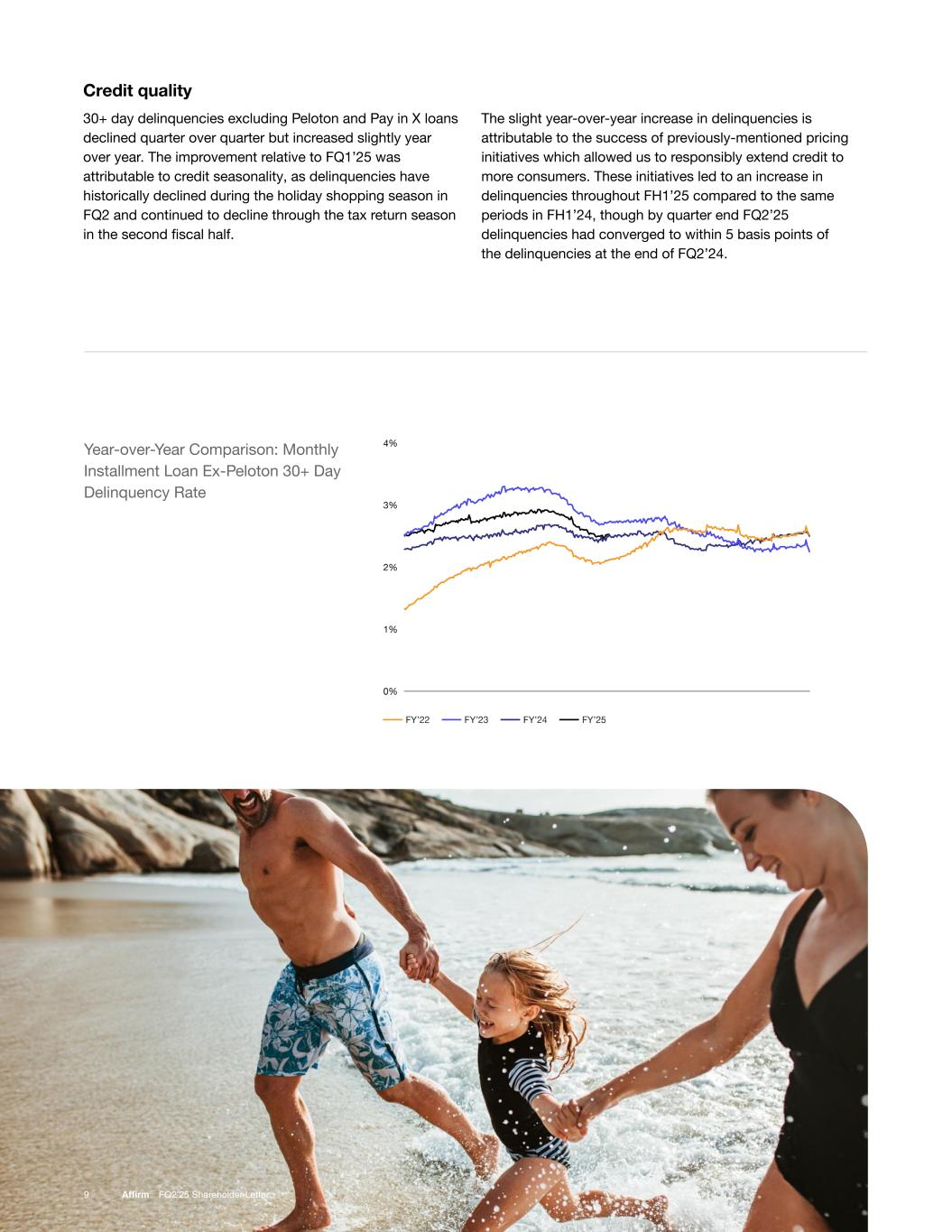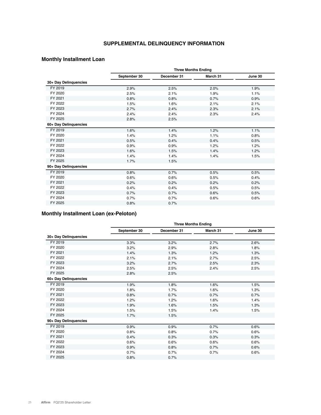 SUPPLEMENTAL DELINQUENCY INFORMATION Three Months Ending September 30 December 31 March 31 June 30 30+ Day Delinquencies FY 2019 2.9% 2.5% 2.0% 1.9% FY 2020 2.5% 2.1% 1.9% 1.1% FY 2021 0.8% 0.8% 0.7% 0.9% FY 2022 1.5% 1.6% 2.1% 2.1% FY 2023 2.7% 2.4% 2.3% 2.1% FY 2024 2.4% 2.4% 2.3% 2.4% FY 2025 2.8% 2.5% 60+ Day Delinquencies FY 2019 1.6% 1.4% 1.2% 1.1% FY 2020 1.4% 1.2% 1.1% 0.8% FY 2021 0.5% 0.4% 0.4% 0.5% FY 2022 0.9% 0.9% 1.2% 1.2% FY 2023 1.6% 1.5% 1.4% 1.2% FY 2024 1.4% 1.4% 1.4% 1.5% FY 2025 1.7% 1.5% 90+ Day Delinquencies FY 2019 0.8% 0.7% 0.5% 0.5% FY 2020 0.6% 0.6% 0.5% 0.4% FY 2021 0.2% 0.2% 0.2% 0.2% FY 2022 0.4% 0.4% 0.5% 0.5% FY 2023 0.7% 0.7% 0.6% 0.5% FY 2024 0.7% 0.7% 0.6% 0.6% FY 2025 0.8% 0.7% Three Months Ending September 30 December 31 March 31 June 30 30+ Day Delinquencies FY 2019 3.3% 3.2% 2.7% 2.6% FY 2020 3.2% 2.9% 2.8% 1.8% FY 2021 1.4% 1.3% 1.2% 1.3% FY 2022 2.1% 2.1% 2.7% 2.5% FY 2023 3.2% 2.7% 2.5% 2.3% FY 2024 2.5% 2.5% 2.4% 2.5% FY 2025 2.8% 2.5% 60+ Day Delinquencies FY 2019 1.9% 1.8% 1.6% 1.5% FY 2020 1.8% 1.7% 1.6% 1.3% FY 2021 0.8% 0.7% 0.7% 0.7% FY 2022 1.2% 1.2% 1.6% 1.4% FY 2023 1.9% 1.6% 1.5% 1.3% FY 2024 1.5% 1.5% 1.4% 1.5% FY 2025 1.7% 1.5% 90+ Day Delinquencies FY 2019 0.9% 0.9% 0.7% 0.6% FY 2020 0.8% 0.8% 0.7% 0.6% FY 2021 0.4% 0.3% 0.3% 0.3% FY 2022 0.6% 0.6% 0.6% 0.6% FY 2023 0.9% 0.8% 0.7% 0.6% FY 2024 0.7% 0.7% 0.7% 0.6% FY 2025 0.8% 0.7% Monthly Installment Loan (ex-Peloton) Monthly Installment Loan 25 Affirm FQ2’25 Shareholder Letter