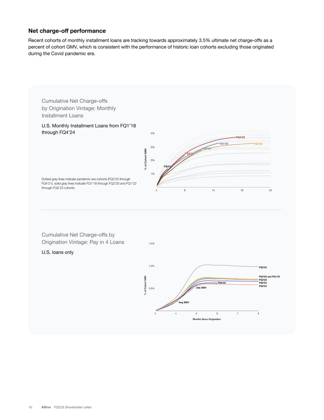 Cumulative Net Charge-offs by Origination Vintage: Monthly Installment Loans U.S. Monthly Installment Loans from FQ1’18 through FQ4’24 Dotted gray lines indicate pandemic-era cohorts (FQ3’20 through FQ4’21), solid gray lines indicate FQ1’18 through FQ2’20 and FQ1’22 through FQ2’23 cohorts 10 Affirm FQ2’25 Shareholder Letter Net charge-off performance Recent cohorts of monthly installment loans are tracking towards approximately 3.5% ultimate net charge-offs as a percent of cohort GMV, which is consistent with the performance of historic loan cohorts excluding those originated during the Covid pandemic era. Cumulative Net Charge-offs by Origination Vintage: Pay in 4 Loans U.S. loans only