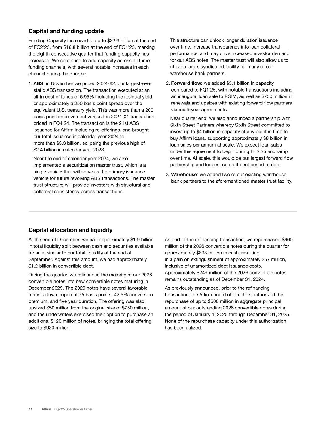 11 Affirm FQ2’25 Shareholder Letter Capital and funding update Funding Capacity increased to up to $22.6 billion at the end of FQ2’25, from $16.8 billion at the end of FQ1’25, marking the eighth consecutive quarter that funding capacity has increased. We continued to add capacity across all three funding channels, with several notable increases in each channel during the quarter: 1. ABS: in November we priced 2024-X2, our largest-ever static ABS transaction. The transaction executed at an all-in cost of funds of 6.95% including the residual yield, or approximately a 250 basis point spread over the equivalent U.S. treasury yield. This was more than a 200 basis point improvement versus the 2024-X1 transaction priced in FQ4’24. The transaction is the 21st ABS issuance for Affirm including re-offerings, and brought our total issuance in calendar year 2024 to more than $3.3 billion, eclipsing the previous high of $2.4 billion in calendar year 2023. Near the end of calendar year 2024, we also implemented a securitization master trust, which is a single vehicle that will serve as the primary issuance vehicle for future revolving ABS transactions. The master trust structure will provide investors with structural and collateral consistency across transactions. This structure can unlock longer duration issuance over time, increase transparency into loan collateral performance, and may drive increased investor demand for our ABS notes. The master trust will also allow us to utilize a large, syndicated facility for many of our warehouse bank partners. 2. Forward flow: we added $5.1 billion in capacity compared to FQ1’25, with notable transactions including an inaugural loan sale to PGIM, as well as $750 million in renewals and upsizes with existing forward flow partners via multi-year agreements. Near quarter end, we also announced a partnership with Sixth Street Partners whereby Sixth Street committed to invest up to $4 billion in capacity at any point in time to buy Affirm loans, supporting approximately $8 billion in loan sales per annum at scale. We expect loan sales under this agreement to begin during FH2’25 and ramp over time. At scale, this would be our largest forward flow partnership and longest commitment period to date. 3. Warehouse: we added two of our existing warehouse bank partners to the aforementioned master trust facility. Capital allocation and liquidity At the end of December, we had approximately $1.9 billion in total liquidity split between cash and securities available for sale, similar to our total liquidity at the end of September. Against this amount, we had approximately $1.2 billion in convertible debt. During the quarter, we refinanced the majority of our 2026 convertible notes into new convertible notes maturing in December 2029. The 2029 notes have several favorable terms: a low coupon at 75 basis points, 42.5% conversion premium, and five year duration. The offering was also upsized $50 million from the original size of $750 million, and the underwriters exercised their option to purchase an additional $120 million of notes, bringing the total offering size to $920 million. As part of the refinancing transaction, we repurchased $960 million of the 2026 convertible notes during the quarter for approximately $893 million in cash, resulting in a gain on extinguishment of approximately $67 million, inclusive of unamortized debt issuance costs. Approximately $249 million of the 2026 convertible notes remains outstanding as of December 31, 2024. As previously announced, prior to the refinancing transaction, the Affirm board of directors authorized the repurchase of up to $500 million in aggregate principal amount of our outstanding 2026 convertible notes during the period of January 1, 2025 through December 31, 2025. None of the repurchase capacity under this authorization has been utilized.