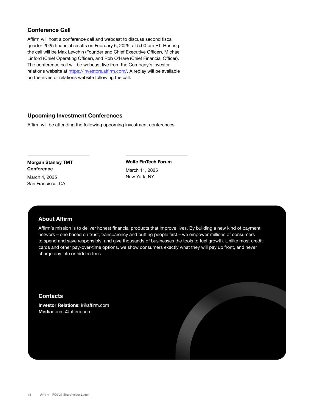 13 Affirm FQ2’25 Shareholder Letter About Affirm Affirm’s mission is to deliver honest financial products that improve lives. By building a new kind of payment network – one based on trust, transparency and putting people first – we empower millions of consumers to spend and save responsibly, and give thousands of businesses the tools to fuel growth. Unlike most credit cards and other pay-over-time options, we show consumers exactly what they will pay up front, and never charge any late or hidden fees. Contacts Investor Relations: ir@affirm.com Media: press@affirm.com Conference Call Affirm will host a conference call and webcast to discuss second fiscal quarter 2025 financial results on February 6, 2025, at 5:00 pm ET. Hosting the call will be Max Levchin (Founder and Chief Executive Officer), Michael Linford (Chief Operating Officer), and Rob O’Hare (Chief Financial Officer). The conference call will be webcast live from the Company's investor relations website at https://investors.affirm.com/. A replay will be available on the investor relations website following the call. Morgan Stanley TMT Conference March 4, 2025 San Francisco, CA Wolfe FinTech Forum March 11, 2025 New York, NY Upcoming Investment Conferences Affirm will be attending the following upcoming investment conferences: