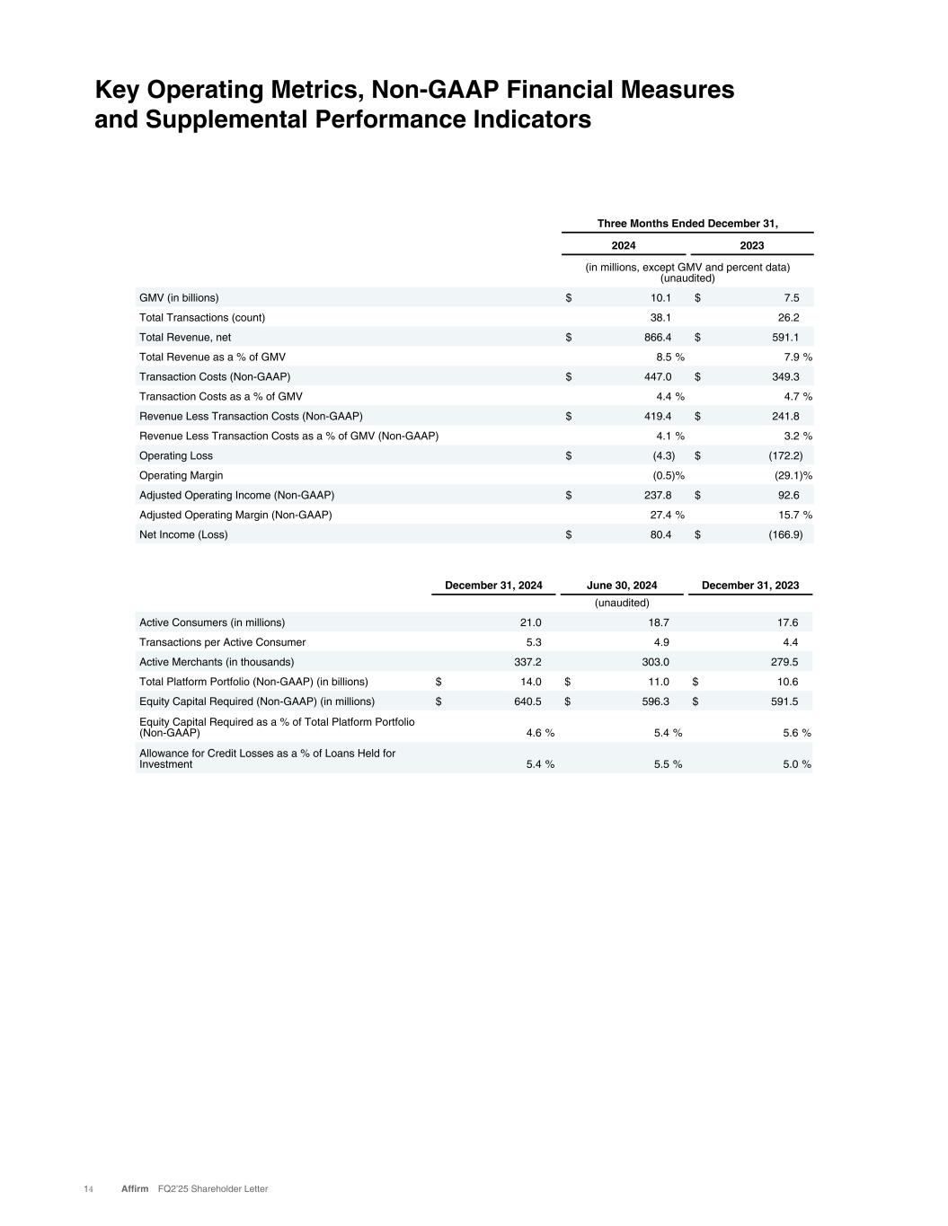 Three Months Ended December 31, 2024 2023 (in millions, except GMV and percent data) (unaudited) GMV (in billions) $ 10.1 $ 7.5 Total Transactions (count) 38.1 26.2 Total Revenue, net $ 866.4 $ 591.1 Total Revenue as a % of GMV 8.5 % 7.9 % Transaction Costs (Non-GAAP) $ 447.0 $ 349.3 Transaction Costs as a % of GMV 4.4 % 4.7 % Revenue Less Transaction Costs (Non-GAAP) $ 419.4 $ 241.8 Revenue Less Transaction Costs as a % of GMV (Non-GAAP) 4.1 % 3.2 % Operating Loss $ (4.3) $ (172.2) Operating Margin (0.5) % (29.1) % Adjusted Operating Income (Non-GAAP) $ 237.8 $ 92.6 Adjusted Operating Margin (Non-GAAP) 27.4 % 15.7 % Net Income (Loss) $ 80.4 $ (166.9) Key Operating Metrics, Non-GAAP Financial Measures and Supplemental Performance Indicators December 31, 2024 June 30, 2024 December 31, 2023 (unaudited) Active Consumers (in millions) 21.0 18.7 17.6 Transactions per Active Consumer 5.3 4.9 4.4 Active Merchants (in thousands) 337.2 303.0 279.5 Total Platform Portfolio (Non-GAAP) (in billions) $ 14.0 $ 11.0 $ 10.6 Equity Capital Required (Non-GAAP) (in millions) $ 640.5 $ 596.3 $ 591.5 Equity Capital Required as a % of Total Platform Portfolio (Non-GAAP) 4.6 % 5.4 % 5.6 % Allowance for Credit Losses as a % of Loans Held for Investment 5.4 % 5.5 % 5.0 % 14 Affirm FQ2’25 Shareholder Letter
