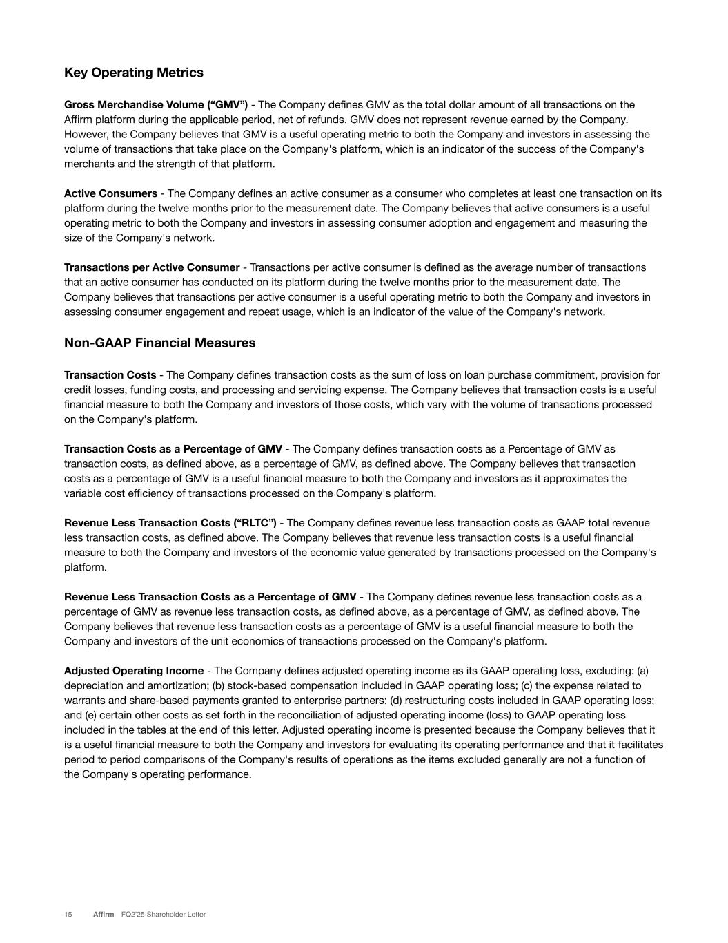 Key Operating Metrics Gross Merchandise Volume (“GMV”) - The Company defines GMV as the total dollar amount of all transactions on the Affirm platform during the applicable period, net of refunds. GMV does not represent revenue earned by the Company. However, the Company believes that GMV is a useful operating metric to both the Company and investors in assessing the volume of transactions that take place on the Company's platform, which is an indicator of the success of the Company's merchants and the strength of that platform. Active Consumers - The Company defines an active consumer as a consumer who completes at least one transaction on its platform during the twelve months prior to the measurement date. The Company believes that active consumers is a useful operating metric to both the Company and investors in assessing consumer adoption and engagement and measuring the size of the Company's network. Transactions per Active Consumer - Transactions per active consumer is defined as the average number of transactions that an active consumer has conducted on its platform during the twelve months prior to the measurement date. The Company believes that transactions per active consumer is a useful operating metric to both the Company and investors in assessing consumer engagement and repeat usage, which is an indicator of the value of the Company's network. Non-GAAP Financial Measures Transaction Costs - The Company defines transaction costs as the sum of loss on loan purchase commitment, provision for credit losses, funding costs, and processing and servicing expense. The Company believes that transaction costs is a useful financial measure to both the Company and investors of those costs, which vary with the volume of transactions processed on the Company's platform. Transaction Costs as a Percentage of GMV - The Company defines transaction costs as a Percentage of GMV as transaction costs, as defined above, as a percentage of GMV, as defined above. The Company believes that transaction costs as a percentage of GMV is a useful financial measure to both the Company and investors as it approximates the variable cost efficiency of transactions processed on the Company's platform. Revenue Less Transaction Costs (“RLTC”) - The Company defines revenue less transaction costs as GAAP total revenue less transaction costs, as defined above. The Company believes that revenue less transaction costs is a useful financial measure to both the Company and investors of the economic value generated by transactions processed on the Company's platform. Revenue Less Transaction Costs as a Percentage of GMV - The Company defines revenue less transaction costs as a percentage of GMV as revenue less transaction costs, as defined above, as a percentage of GMV, as defined above. The Company believes that revenue less transaction costs as a percentage of GMV is a useful financial measure to both the Company and investors of the unit economics of transactions processed on the Company's platform. Adjusted Operating Income - The Company defines adjusted operating income as its GAAP operating loss, excluding: (a) depreciation and amortization; (b) stock-based compensation included in GAAP operating loss; (c) the expense related to warrants and share-based payments granted to enterprise partners; (d) restructuring costs included in GAAP operating loss; and (e) certain other costs as set forth in the reconciliation of adjusted operating income (loss) to GAAP operating loss included in the tables at the end of this letter. Adjusted operating income is presented because the Company believes that it is a useful financial measure to both the Company and investors for evaluating its operating performance and that it facilitates period to period comparisons of the Company's results of operations as the items excluded generally are not a function of the Company's operating performance. 15 Affirm FQ2’25 Shareholder Letter