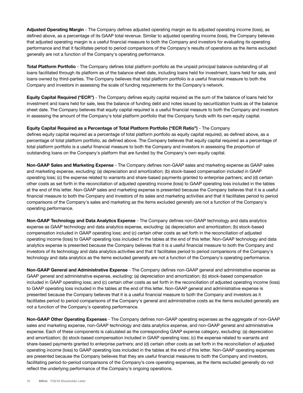 Adjusted Operating Margin - The Company defines adjusted operating margin as its adjusted operating income (loss), as defined above, as a percentage of its GAAP total revenue. Similar to adjusted operating income (loss), the Company believes that adjusted operating margin is a useful financial measure to both the Company and investors for evaluating its operating performance and that it facilitates period to period comparisons of the Company's results of operations as the items excluded generally are not a function of the Company's operating performance. Total Platform Portfolio - The Company defines total platform portfolio as the unpaid principal balance outstanding of all loans facilitated through its platform as of the balance sheet date, including loans held for investment, loans held for sale, and loans owned by third-parties. The Company believes that total platform portfolio is a useful financial measure to both the Company and investors in assessing the scale of funding requirements for the Company's network. Equity Capital Required (“ECR”) - The Company defines equity capital required as the sum of the balance of loans held for investment and loans held for sale, less the balance of funding debt and notes issued by securitization trusts as of the balance sheet date. The Company believes that equity capital required is a useful financial measure to both the Company and investors in assessing the amount of the Company's total platform portfolio that the Company funds with its own equity capital. Equity Capital Required as a Percentage of Total Platform Portfolio (“ECR Ratio”) - The Company defines equity capital required as a percentage of total platform portfolio as equity capital required, as defined above, as a percentage of total platform portfolio, as defined above. The Company believes that equity capital required as a percentage of total platform portfolio is a useful financial measure to both the Company and investors in assessing the proportion of outstanding loans on the Company's platform that are funded by the Company's own equity capital. Non-GAAP Sales and Marketing Expense - The Company defines non-GAAP sales and marketing expense as GAAP sales and marketing expense, excluding: (a) depreciation and amortization; (b) stock-based compensation included in GAAP operating loss; (c) the expense related to warrants and share-based payments granted to enterprise partners; and (d) certain other costs as set forth in the reconciliation of adjusted operating income (loss) to GAAP operating loss included in the tables at the end of this letter. Non-GAAP sales and marketing expense is presented because the Company believes that it is a useful financial measure to both the Company and investors of its sales and marketing activities and that it facilitates period to period comparisons of the Company's sales and marketing as the items excluded generally are not a function of the Company's operating performance. Non-GAAP Technology and Data Analytics Expense - The Company defines non-GAAP technology and data analytics expense as GAAP technology and data analytics expense, excluding: (a) depreciation and amortization; (b) stock-based compensation included in GAAP operating loss; and (c) certain other costs as set forth in the reconciliation of adjusted operating income (loss) to GAAP operating loss included in the tables at the end of this letter. Non-GAAP technology and data analytics expense is presented because the Company believes that it is a useful financial measure to both the Company and investors of its technology and data analytics activities and that it facilitates period to period comparisons of the Company's technology and data analytics as the items excluded generally are not a function of the Company's operating performance. Non-GAAP General and Administrative Expense - The Company defines non-GAAP general and administrative expense as GAAP general and administrative expense, excluding: (a) depreciation and amortization; (b) stock-based compensation included in GAAP operating loss; and (c) certain other costs as set forth in the reconciliation of adjusted operating income (loss) to GAAP operating loss included in the tables at the end of this letter. Non-GAAP general and administrative expense is presented because the Company believes that it is a useful financial measure to both the Company and investors as it facilitates period to period comparisons of the Company's general and administrative costs as the items excluded generally are not a function of the Company's operating performance. Non-GAAP Other Operating Expenses - The Company defines non-GAAP operating expenses as the aggregate of non-GAAP sales and marketing expense, non-GAAP technology and data analytics expense, and non-GAAP general and administrative expense. Each of these components is calculated as the corresponding GAAP expense category, excluding: (a) depreciation and amortization; (b) stock-based compensation included in GAAP operating loss; (c) the expense related to warrants and share-based payments granted to enterprise partners; and (d) certain other costs as set forth in the reconciliation of adjusted operating income (loss) to GAAP operating loss included in the tables at the end of this letter. Non-GAAP operating expenses are presented because the Company believes that they are useful financial measures to both the Company and investors, facilitating period-to-period comparisons of the Company’s core operating expenses, as the items excluded generally do not reflect the underlying performance of the Company's ongoing operations. 16 Affirm FQ2’25 Shareholder Letter