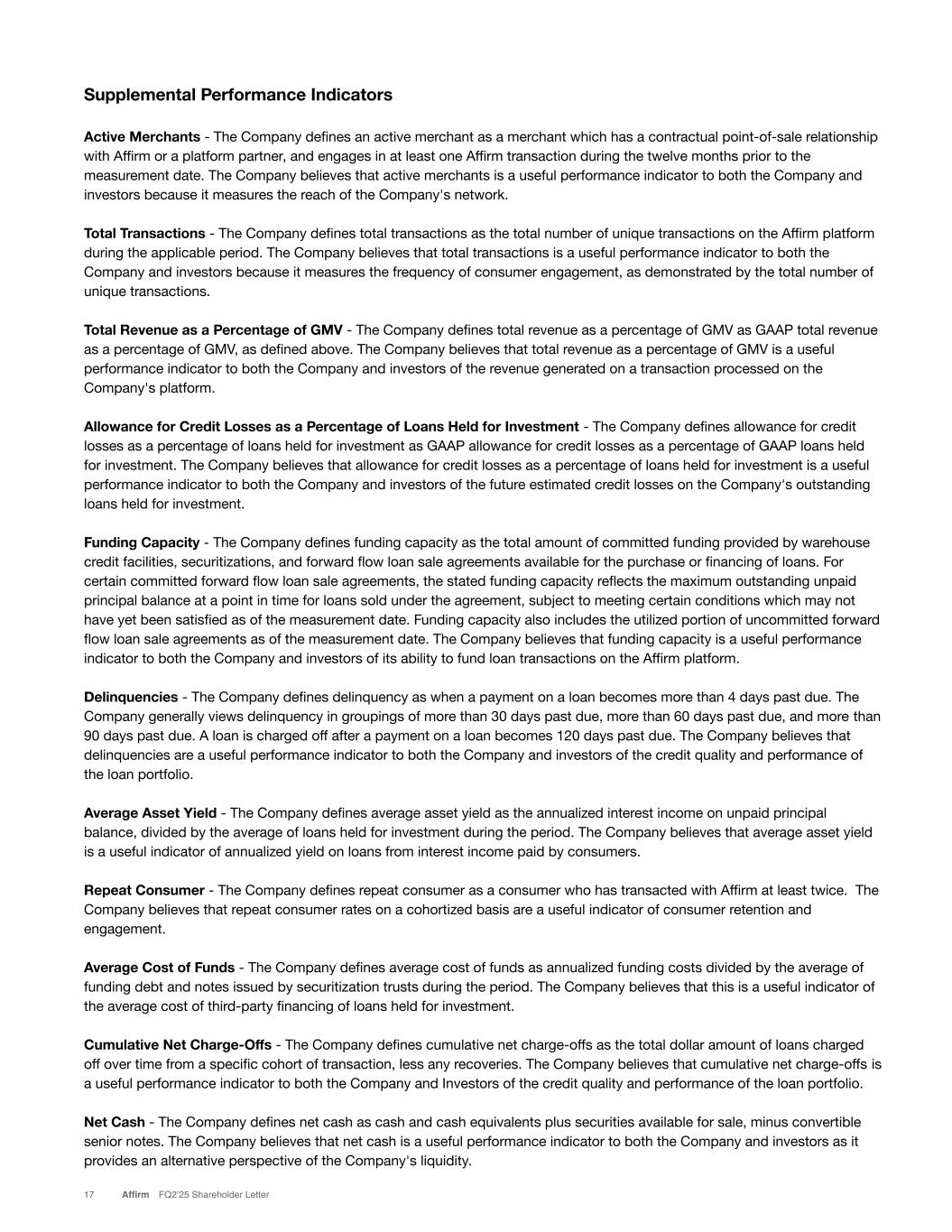 Supplemental Performance Indicators Active Merchants - The Company defines an active merchant as a merchant which has a contractual point-of-sale relationship with Affirm or a platform partner, and engages in at least one Affirm transaction during the twelve months prior to the measurement date. The Company believes that active merchants is a useful performance indicator to both the Company and investors because it measures the reach of the Company's network. Total Transactions - The Company defines total transactions as the total number of unique transactions on the Affirm platform during the applicable period. The Company believes that total transactions is a useful performance indicator to both the Company and investors because it measures the frequency of consumer engagement, as demonstrated by the total number of unique transactions. Total Revenue as a Percentage of GMV - The Company defines total revenue as a percentage of GMV as GAAP total revenue as a percentage of GMV, as defined above. The Company believes that total revenue as a percentage of GMV is a useful performance indicator to both the Company and investors of the revenue generated on a transaction processed on the Company's platform. Allowance for Credit Losses as a Percentage of Loans Held for Investment - The Company defines allowance for credit losses as a percentage of loans held for investment as GAAP allowance for credit losses as a percentage of GAAP loans held for investment. The Company believes that allowance for credit losses as a percentage of loans held for investment is a useful performance indicator to both the Company and investors of the future estimated credit losses on the Company's outstanding loans held for investment. Funding Capacity - The Company defines funding capacity as the total amount of committed funding provided by warehouse credit facilities, securitizations, and forward flow loan sale agreements available for the purchase or financing of loans. For certain committed forward flow loan sale agreements, the stated funding capacity reflects the maximum outstanding unpaid principal balance at a point in time for loans sold under the agreement, subject to meeting certain conditions which may not have yet been satisfied as of the measurement date. Funding capacity also includes the utilized portion of uncommitted forward flow loan sale agreements as of the measurement date. The Company believes that funding capacity is a useful performance indicator to both the Company and investors of its ability to fund loan transactions on the Affirm platform. Delinquencies - The Company defines delinquency as when a payment on a loan becomes more than 4 days past due. The Company generally views delinquency in groupings of more than 30 days past due, more than 60 days past due, and more than 90 days past due. A loan is charged off after a payment on a loan becomes 120 days past due. The Company believes that delinquencies are a useful performance indicator to both the Company and investors of the credit quality and performance of the loan portfolio. Average Asset Yield - The Company defines average asset yield as the annualized interest income on unpaid principal balance, divided by the average of loans held for investment during the period. The Company believes that average asset yield is a useful indicator of annualized yield on loans from interest income paid by consumers. Repeat Consumer - The Company defines repeat consumer as a consumer who has transacted with Affirm at least twice. The Company believes that repeat consumer rates on a cohortized basis are a useful indicator of consumer retention and engagement. Average Cost of Funds - The Company defines average cost of funds as annualized funding costs divided by the average of funding debt and notes issued by securitization trusts during the period. The Company believes that this is a useful indicator of the average cost of third-party financing of loans held for investment. Cumulative Net Charge-Offs - The Company defines cumulative net charge-offs as the total dollar amount of loans charged off over time from a specific cohort of transaction, less any recoveries. The Company believes that cumulative net charge-offs is a useful performance indicator to both the Company and Investors of the credit quality and performance of the loan portfolio. Net Cash - The Company defines net cash as cash and cash equivalents plus securities available for sale, minus convertible senior notes. The Company believes that net cash is a useful performance indicator to both the Company and investors as it provides an alternative perspective of the Company's liquidity. 17 Affirm FQ2’25 Shareholder Letter