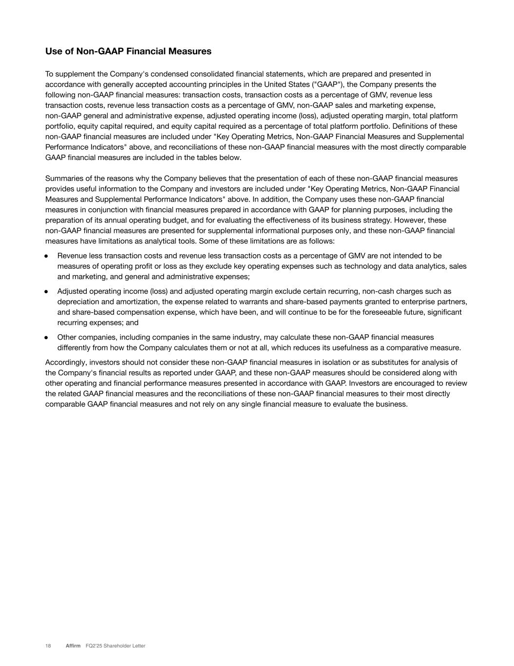 Use of Non-GAAP Financial Measures To supplement the Company's condensed consolidated financial statements, which are prepared and presented in accordance with generally accepted accounting principles in the United States ("GAAP"), the Company presents the following non-GAAP financial measures: transaction costs, transaction costs as a percentage of GMV, revenue less transaction costs, revenue less transaction costs as a percentage of GMV, non-GAAP sales and marketing expense, non-GAAP general and administrative expense, adjusted operating income (loss), adjusted operating margin, total platform portfolio, equity capital required, and equity capital required as a percentage of total platform portfolio. Definitions of these non-GAAP financial measures are included under "Key Operating Metrics, Non-GAAP Financial Measures and Supplemental Performance Indicators" above, and reconciliations of these non-GAAP financial measures with the most directly comparable GAAP financial measures are included in the tables below. Summaries of the reasons why the Company believes that the presentation of each of these non-GAAP financial measures provides useful information to the Company and investors are included under "Key Operating Metrics, Non-GAAP Financial Measures and Supplemental Performance Indicators" above. In addition, the Company uses these non-GAAP financial measures in conjunction with financial measures prepared in accordance with GAAP for planning purposes, including the preparation of its annual operating budget, and for evaluating the effectiveness of its business strategy. However, these non-GAAP financial measures are presented for supplemental informational purposes only, and these non-GAAP financial measures have limitations as analytical tools. Some of these limitations are as follows: ● Revenue less transaction costs and revenue less transaction costs as a percentage of GMV are not intended to be measures of operating profit or loss as they exclude key operating expenses such as technology and data analytics, sales and marketing, and general and administrative expenses; ● Adjusted operating income (loss) and adjusted operating margin exclude certain recurring, non-cash charges such as depreciation and amortization, the expense related to warrants and share-based payments granted to enterprise partners, and share-based compensation expense, which have been, and will continue to be for the foreseeable future, significant recurring expenses; and ● Other companies, including companies in the same industry, may calculate these non-GAAP financial measures differently from how the Company calculates them or not at all, which reduces its usefulness as a comparative measure. Accordingly, investors should not consider these non-GAAP financial measures in isolation or as substitutes for analysis of the Company's financial results as reported under GAAP, and these non-GAAP measures should be considered along with other operating and financial performance measures presented in accordance with GAAP. Investors are encouraged to review the related GAAP financial measures and the reconciliations of these non-GAAP financial measures to their most directly comparable GAAP financial measures and not rely on any single financial measure to evaluate the business. 18 Affirm FQ2’25 Shareholder Letter