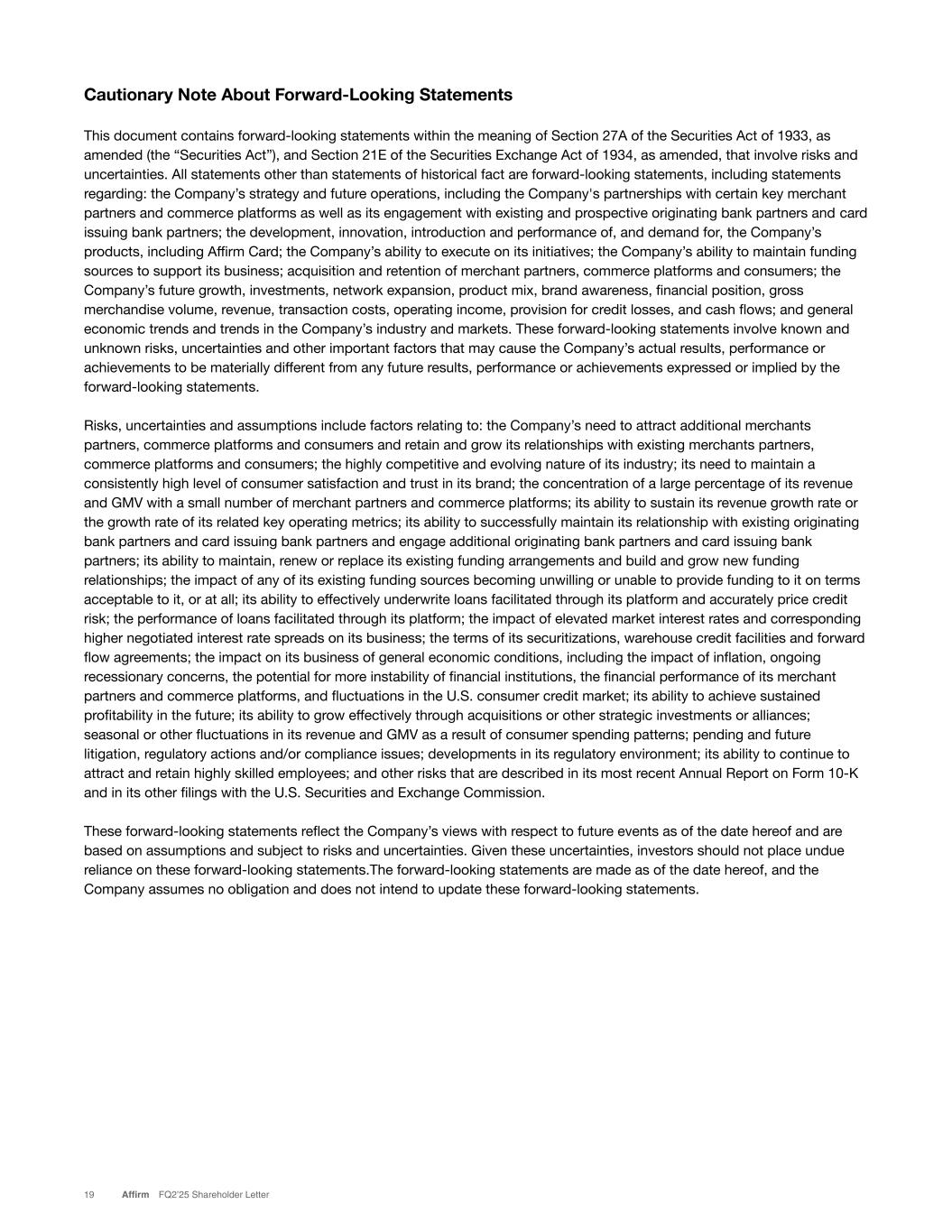 Cautionary Note About Forward-Looking Statements This document contains forward-looking statements within the meaning of Section 27A of the Securities Act of 1933, as amended (the “Securities Act”), and Section 21E of the Securities Exchange Act of 1934, as amended, that involve risks and uncertainties. All statements other than statements of historical fact are forward-looking statements, including statements regarding: the Company’s strategy and future operations, including the Company's partnerships with certain key merchant partners and commerce platforms as well as its engagement with existing and prospective originating bank partners and card issuing bank partners; the development, innovation, introduction and performance of, and demand for, the Company’s products, including Affirm Card; the Company’s ability to execute on its initiatives; the Company’s ability to maintain funding sources to support its business; acquisition and retention of merchant partners, commerce platforms and consumers; the Company’s future growth, investments, network expansion, product mix, brand awareness, financial position, gross merchandise volume, revenue, transaction costs, operating income, provision for credit losses, and cash flows; and general economic trends and trends in the Company’s industry and markets. These forward-looking statements involve known and unknown risks, uncertainties and other important factors that may cause the Company’s actual results, performance or achievements to be materially different from any future results, performance or achievements expressed or implied by the forward-looking statements. Risks, uncertainties and assumptions include factors relating to: the Company’s need to attract additional merchants partners, commerce platforms and consumers and retain and grow its relationships with existing merchants partners, commerce platforms and consumers; the highly competitive and evolving nature of its industry; its need to maintain a consistently high level of consumer satisfaction and trust in its brand; the concentration of a large percentage of its revenue and GMV with a small number of merchant partners and commerce platforms; its ability to sustain its revenue growth rate or the growth rate of its related key operating metrics; its ability to successfully maintain its relationship with existing originating bank partners and card issuing bank partners and engage additional originating bank partners and card issuing bank partners; its ability to maintain, renew or replace its existing funding arrangements and build and grow new funding relationships; the impact of any of its existing funding sources becoming unwilling or unable to provide funding to it on terms acceptable to it, or at all; its ability to effectively underwrite loans facilitated through its platform and accurately price credit risk; the performance of loans facilitated through its platform; the impact of elevated market interest rates and corresponding higher negotiated interest rate spreads on its business; the terms of its securitizations, warehouse credit facilities and forward flow agreements; the impact on its business of general economic conditions, including the impact of inflation, ongoing recessionary concerns, the potential for more instability of financial institutions, the financial performance of its merchant partners and commerce platforms, and fluctuations in the U.S. consumer credit market; its ability to achieve sustained profitability in the future; its ability to grow effectively through acquisitions or other strategic investments or alliances; seasonal or other fluctuations in its revenue and GMV as a result of consumer spending patterns; pending and future litigation, regulatory actions and/or compliance issues; developments in its regulatory environment; its ability to continue to attract and retain highly skilled employees; and other risks that are described in its most recent Annual Report on Form 10-K and in its other filings with the U.S. Securities and Exchange Commission. These forward-looking statements reflect the Company’s views with respect to future events as of the date hereof and are based on assumptions and subject to risks and uncertainties. Given these uncertainties, investors should not place undue reliance on these forward-looking statements.The forward-looking statements are made as of the date hereof, and the Company assumes no obligation and does not intend to update these forward-looking statements. 19 Affirm FQ2’25 Shareholder Letter