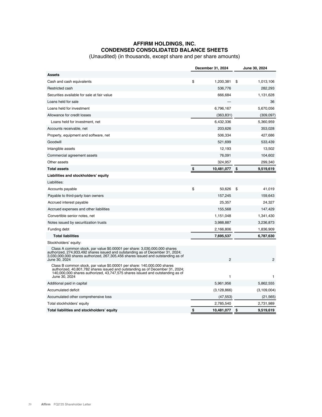December 31, 2024 June 30, 2024 Assets Cash and cash equivalents $ 1,200,381 $ 1,013,106 Restricted cash 536,776 282,293 Securities available for sale at fair value 666,684 1,131,628 Loans held for sale — 36 Loans held for investment 6,796,167 5,670,056 Allowance for credit losses (363,831) (309,097) Loans held for investment, net 6,432,336 5,360,959 Accounts receivable, net 203,626 353,028 Property, equipment and software, net 506,334 427,686 Goodwill 521,699 533,439 Intangible assets 12,193 13,502 Commercial agreement assets 76,091 104,602 Other assets 324,957 299,340 Total assets $ 10,481,077 $ 9,519,619 Liabilities and stockholders’ equity Liabilities: Accounts payable $ 50,626 $ 41,019 Payable to third-party loan owners 157,245 159,643 Accrued interest payable 25,357 24,327 Accrued expenses and other liabilities 155,568 147,429 Convertible senior notes, net 1,151,048 1,341,430 Notes issued by securitization trusts 3,988,887 3,236,873 Funding debt 2,166,806 1,836,909 Total liabilities 7,695,537 6,787,630 Stockholders’ equity: Class A common stock, par value $0.00001 per share: 3,030,000,000 shares authorized, 274,933,492 shares issued and outstanding as of December 31, 2024; 3,030,000,000 shares authorized, 267,305,456 shares issued and outstanding as of June 30, 2024 2 2 Class B common stock, par value $0.00001 per share: 140,000,000 shares authorized, 40,801,782 shares issued and outstanding as of December 31, 2024; 140,000,000 shares authorized, 43,747,575 shares issued and outstanding as of June 30, 2024 1 1 Additional paid in capital 5,961,956 5,862,555 Accumulated deficit (3,128,866) (3,109,004) Accumulated other comprehensive loss (47,553) (21,565) Total stockholders’ equity 2,785,540 2,731,989 Total liabilities and stockholders’ equity $ 10,481,077 $ 9,519,619 AFFIRM HOLDINGS, INC. CONDENSED CONSOLIDATED BALANCE SHEETS (Unaudited) (in thousands, except share and per share amounts) 20 Affirm FQ2’25 Shareholder Letter