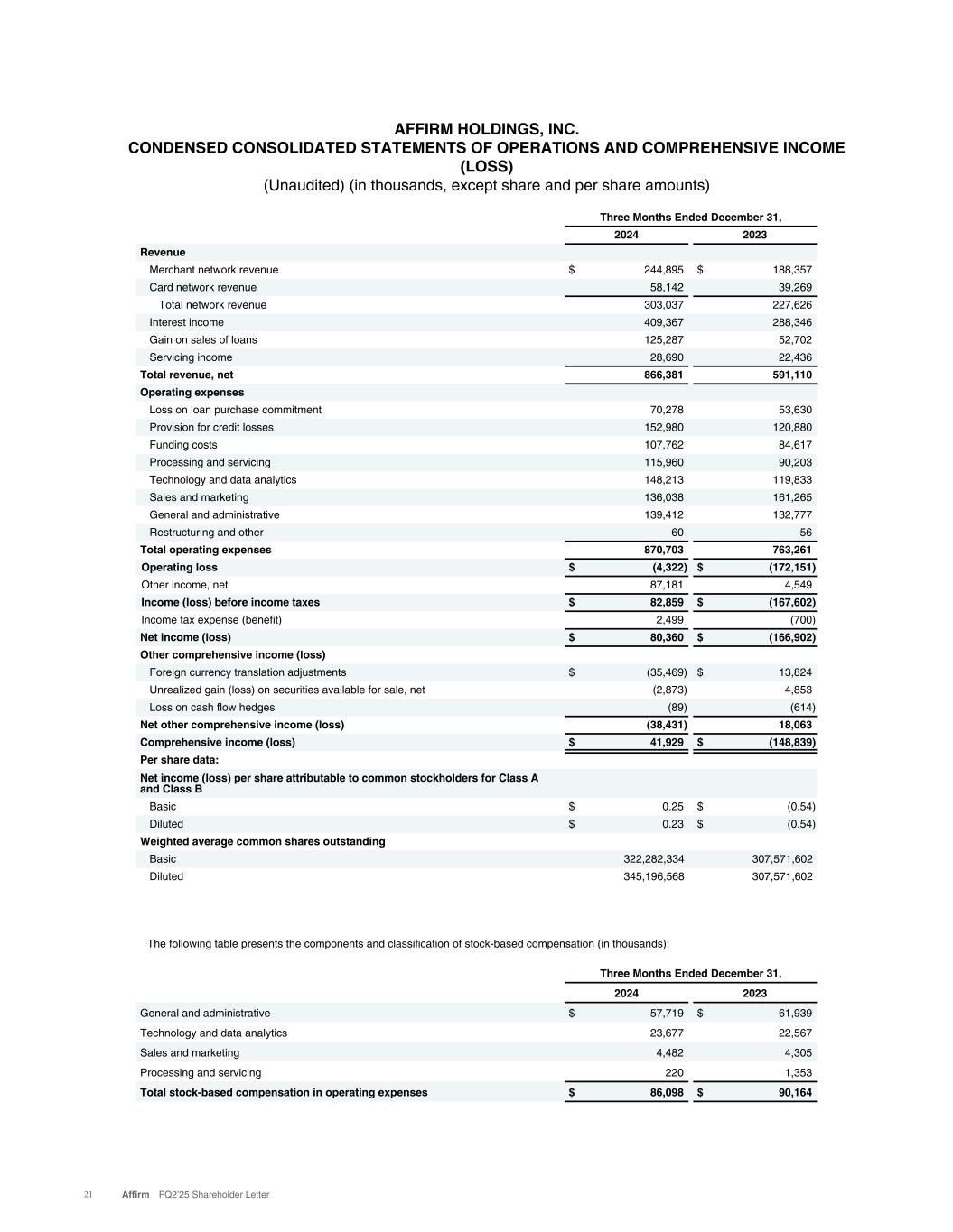 AFFIRM HOLDINGS, INC. CONDENSED CONSOLIDATED STATEMENTS OF OPERATIONS AND COMPREHENSIVE INCOME (LOSS) (Unaudited) (in thousands, except share and per share amounts) Three Months Ended December 31, 2024 2023 Revenue Merchant network revenue $ 244,895 $ 188,357 Card network revenue 58,142 39,269 Total network revenue 303,037 227,626 Interest income 409,367 288,346 Gain on sales of loans 125,287 52,702 Servicing income 28,690 22,436 Total revenue, net 866,381 591,110 Operating expenses Loss on loan purchase commitment 70,278 53,630 Provision for credit losses 152,980 120,880 Funding costs 107,762 84,617 Processing and servicing 115,960 90,203 Technology and data analytics 148,213 119,833 Sales and marketing 136,038 161,265 General and administrative 139,412 132,777 Restructuring and other 60 56 Total operating expenses 870,703 763,261 Operating loss $ (4,322) $ (172,151) Other income, net 87,181 4,549 Income (loss) before income taxes $ 82,859 $ (167,602) Income tax expense (benefit) 2,499 (700) Net income (loss) $ 80,360 $ (166,902) Other comprehensive income (loss) Foreign currency translation adjustments $ (35,469) $ 13,824 Unrealized gain (loss) on securities available for sale, net (2,873) 4,853 Loss on cash flow hedges (89) (614) Net other comprehensive income (loss) (38,431) 18,063 Comprehensive income (loss) $ 41,929 $ (148,839) Per share data: Net income (loss) per share attributable to common stockholders for Class A and Class B Basic $ 0.25 $ (0.54) Diluted $ 0.23 $ (0.54) Weighted average common shares outstanding Basic 322,282,334 307,571,602 Diluted 345,196,568 307,571,602 Three Months Ended December 31, 2024 2023 General and administrative $ 57,719 $ 61,939 Technology and data analytics 23,677 22,567 Sales and marketing 4,482 4,305 Processing and servicing 220 1,353 Total stock-based compensation in operating expenses $ 86,098 $ 90,164 The following table presents the components and classification of stock-based compensation (in thousands): 21 Affirm FQ2’25 Shareholder Letter