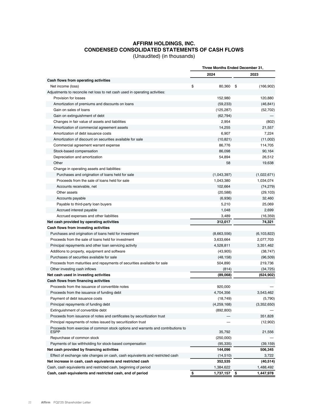 AFFIRM HOLDINGS, INC. CONDENSED CONSOLIDATED STATEMENTS OF CASH FLOWS (Unaudited) (in thousands) Three Months Ended December 31, 2024 2023 Cash flows from operating activities Net income (loss) $ 80,360 $ (166,902) Adjustments to reconcile net loss to net cash used in operating activities: Provision for losses 152,980 120,880 Amortization of premiums and discounts on loans (59,233) (46,841) Gain on sales of loans (125,287) (52,702) Gain on extinguishment of debt (62,794) — Changes in fair value of assets and liabilities 2,954 (802) Amortization of commercial agreement assets 14,255 21,557 Amortization of debt issuance costs 6,907 7,224 Amortization of discount on securities available for sale (10,821) (11,002) Commercial agreement warrant expense 86,776 114,705 Stock-based compensation 86,098 90,164 Depreciation and amortization 54,894 26,512 Other 58 19,638 Change in operating assets and liabilities: Purchases and origination of loans held for sale (1,043,397) (1,022,671) Proceeds from the sale of loans held for sale 1,043,380 1,034,074 Accounts receivable, net 102,664 (74,279) Other assets (20,588) (29,103) Accounts payable (6,936) 32,460 Payable to third-party loan buyers 5,210 25,069 Accrued interest payable 1,048 2,699 Accrued expenses and other liabilities 3,489 (16,359) Net cash provided by operating activities 312,017 74,321 Cash flows from investing activities Purchases and origination of loans held for investment (8,663,556) (6,103,822) Proceeds from the sale of loans held for investment 3,633,664 2,077,703 Principal repayments and other loan servicing activity 4,528,811 3,351,462 Additions to property, equipment and software (43,905) (38,747) Purchases of securities available for sale (48,158) (96,509) Proceeds from maturities and repayments of securities available for sale 504,890 219,736 Other investing cash inflows (814) (34,725) Net cash used in investing activities (89,068) (624,902) Cash flows from financing activities Proceeds from the issuance of convertible notes 920,000 — Proceeds from the issuance of funding debt 4,704,356 3,543,462 Payment of debt issuance costs (18,749) (5,790) Principal repayments of funding debt (4,259,168) (3,352,650) Extinguishment of convertible debt (892,800) — Proceeds from issuance of notes and certificates by securitization trust — 351,828 Principal repayments of notes issued by securitization trust — (12,902) Proceeds from exercise of common stock options and warrants and contributions to ESPP 35,792 21,556 Repurchase of common stock (250,000) — Payments of tax withholding for stock-based compensation (95,335) (39,159) Net cash provided by financing activities 144,096 506,345 Effect of exchange rate changes on cash, cash equivalents and restricted cash (14,510) 3,722 Net increase in cash, cash equivalents and restricted cash 352,535 (40,514) Cash, cash equivalents and restricted cash, beginning of period 1,384,622 1,488,492 Cash, cash equivalents and restricted cash, end of period $ 1,737,157 $ 1,447,978 22 Affirm FQ2’25 Shareholder Letter