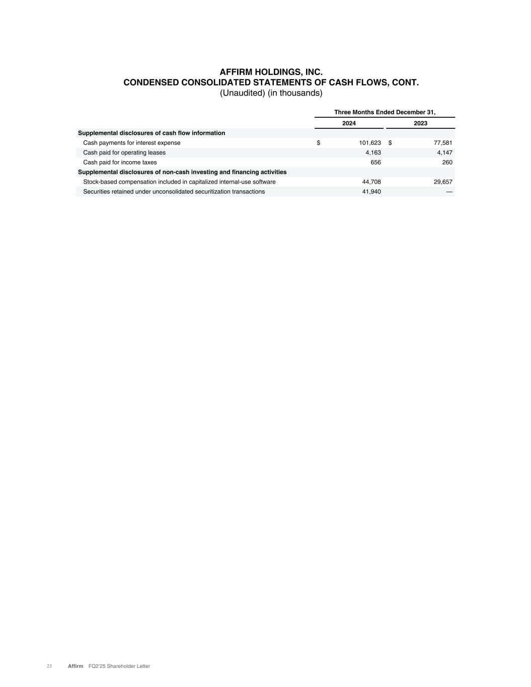 AFFIRM HOLDINGS, INC. CONDENSED CONSOLIDATED STATEMENTS OF CASH FLOWS, CONT. (Unaudited) (in thousands) Three Months Ended December 31, 2024 2023 Supplemental disclosures of cash flow information Cash payments for interest expense $ 101,623 $ 77,581 Cash paid for operating leases 4,163 4,147 Cash paid for income taxes 656 260 Supplemental disclosures of non-cash investing and financing activities Stock-based compensation included in capitalized internal-use software 44,708 29,657 Securities retained under unconsolidated securitization transactions 41,940 — 23 Affirm FQ2’25 Shareholder Letter