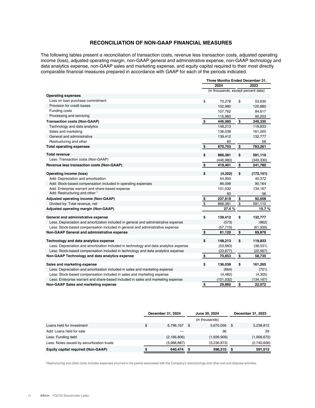 RECONCILIATION OF NON-GAAP FINANCIAL MEASURES The following tables present a reconciliation of transaction costs, revenue less transaction costs, adjusted operating income (loss), adjusted operating margin, non-GAAP general and administrative expense, non-GAAP technology and data analytics expense, non-GAAP sales and marketing expense, and equity capital required to their most directly comparable financial measures prepared in accordance with GAAP for each of the periods indicated. Three Months Ended December 31, 2024 2023 (in thousands, except percent data) Operating expenses Loss on loan purchase commitment $ 70,278 $ 53,630 Provision for credit losses 152,980 120,880 Funding costs 107,762 84,617 Processing and servicing 115,960 90,203 Transaction costs (Non-GAAP) $ 446,980 $ 349,330 Technology and data analytics 148,213 119,833 Sales and marketing 136,038 161,265 General and administrative 139,412 132,777 Restructuring and other 60 56 Total operating expenses $ 870,703 $ 763,261 Total revenue $ 866,381 $ 591,110 Less: Transaction costs (Non-GAAP) (446,980) (349,330) Revenue less transaction costs (Non-GAAP) $ 419,401 $ 241,780 Operating income (loss) $ (4,322) $ (172,151) Add: Depreciation and amortization 54,950 40,372 Add: Stock-based compensation included in operating expenses 86,098 90,164 Add: Enterprise warrant and share-based expense 101,032 134,167 Add: Restructuring and other 1 60 56 Adjusted operating income (Non-GAAP) $ 237,818 $ 92,608 Divided by: Total revenue, net $ 866,381 $ 591,110 Adjusted operating margin (Non-GAAP) 27.4 % 15.7 % General and administrative expense $ 139,412 $ 132,777 Less: Depreciation and amortization included in general and administrative expense (573) (962) Less: Stock-based compensation included in general and administrative expense (57,719) (61,939) Non-GAAP General and administrative expense $ 81,120 $ 69,876 Technology and data analytics expense $ 148,213 $ 119,833 Less: Depreciation and amortization included in technology and data analytics expense (53,683) (38,531) Less: Stock-based compensation included in technology and data analytics expense (23,677) (22,567) Non-GAAP Technology and data analytics expense $ 70,853 $ 58,735 Sales and marketing expense $ 136,038 $ 161,265 Less: Depreciation and amortization included in sales and marketing expense (664) (721) Less: Stock-based compensation included in sales and marketing expense (4,482) (4,305) Less: Enterprise warrant and share-based included in sales and marketing expense (101,032) (134,167) Non-GAAP Sales and marketing expense $ 29,860 $ 22,072 December 31, 2024 June 30, 2024 December 31, 2023 (in thousands) Loans held for investment $ 6,796,167 $ 5,670,056 $ 5,238,812 Add: Loans held for sale — 36 29 Less: Funding debt (2,166,806) (1,836,909) (1,906,672) Less: Notes issued by securitization trusts (3,988,887) (3,236,873) (2,740,656) Equity capital required (Non-GAAP) $ 640,474 $ 596,310 $ 591,513 1 Restructuring and other costs includes expenses incurred in the period associated with the Company's restructurings and other exit and disposal activities. 24 Affirm FQ2’25 Shareholder Letter